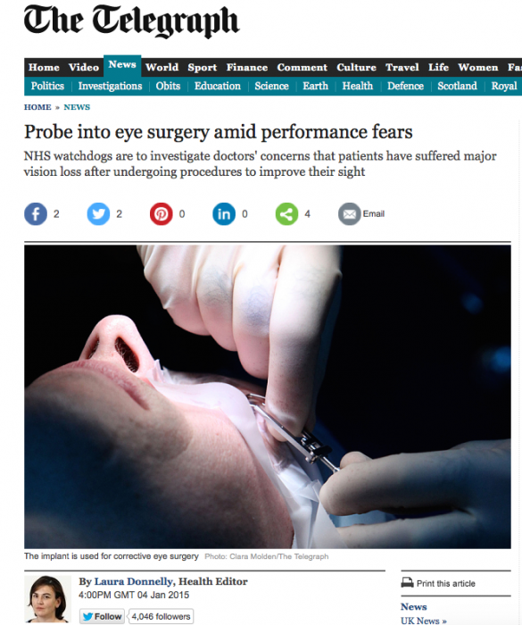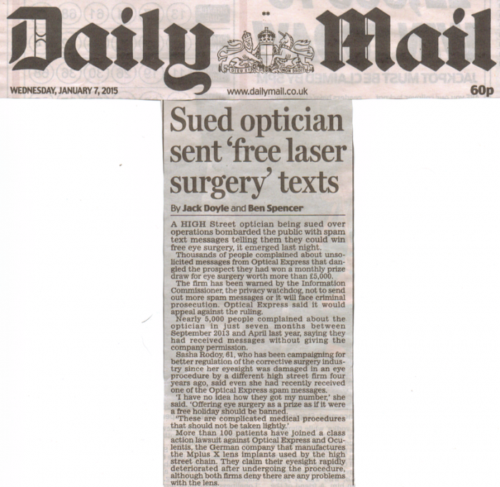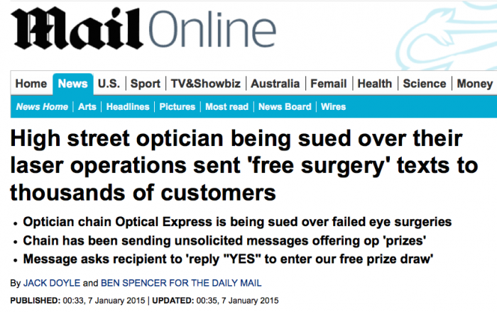 NB: The word "Blindness" has since been removed from the Mail Online story after Optical Express issued legal proceedings against the Daily Mail.
