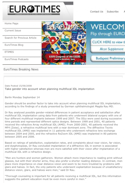 “Men are hunters and women gatherers. Women attach more importance to reading print without glasses, but with their shorter arms, they also prefer a shorter reading distance. In contrast, men place more importance on clear distance vision and seem to be more troubled by problems with glare and haloes. In fact, the only patients who underwent explantation because of unsatisfactory distance vision, glare, and haloes were men,” said Dr Rau.
