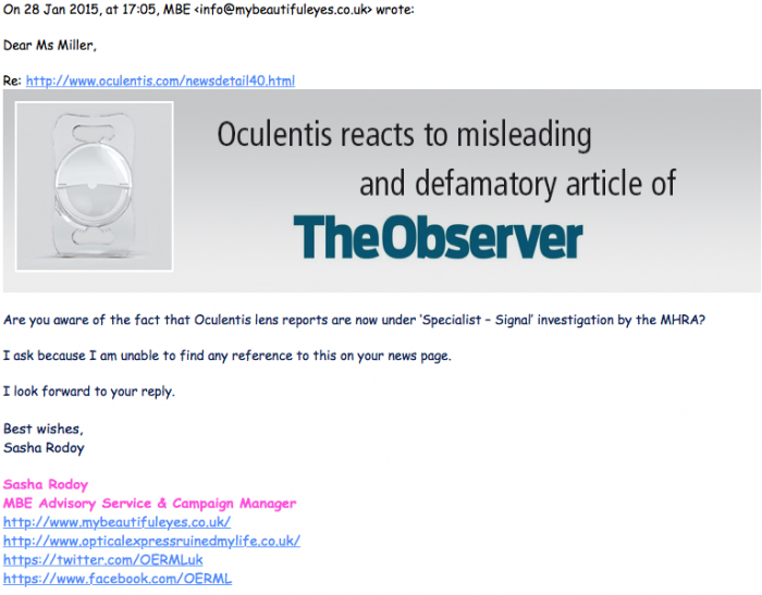 Email to Oculentis CEO, sent yesterday - copied to concerned partiesadmin wrote: I invited them to meet with me, and complaining RLE patients, to discuss the issue.