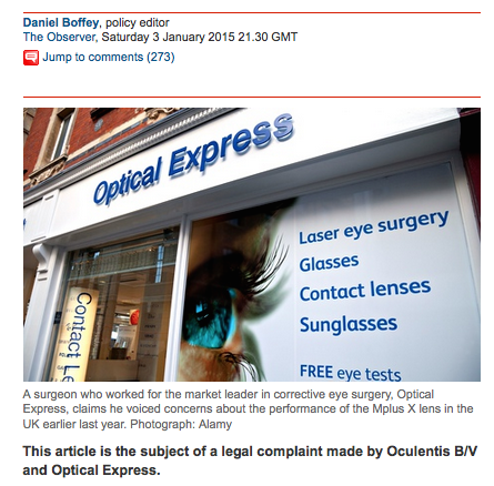 The Guardian page added one line, hardly 'withdrawn' or 'substantially corrected': "This article is the subject of a legal complaint made by Oculentis and Optical Express."