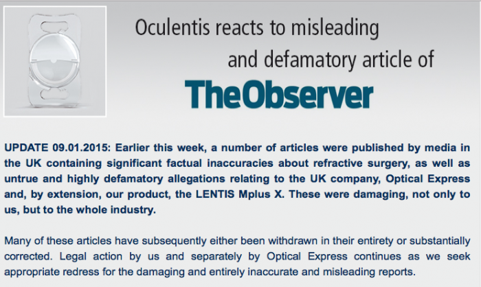 Earlier this week, a number of articles were published by media in the UK containing significant factual inaccuracies about refractive surgery, as well as untrue and highly defamatory allegations relating to the UK company, Optical Express and, by extension, our product, the LENTIS Mplus X. These were damaging, not only to us, but to the whole industry.