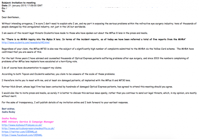 As for: "defamatory allegations relating to the UK company, Optical Express" - I can assure you that Oculentis are fully aware of the many complaints from Optical Express RLE patients on this Forum.