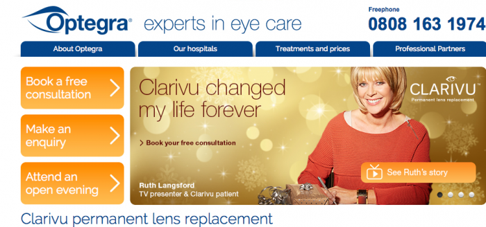 Ruth Langsford's advertised claim was that she was able to throw away her glasses after Clarivu permanent lens replacement at Optegra, until Sasha Rodoy complained to the Advertising Standards Authority and the claim had to be withdrawn.
